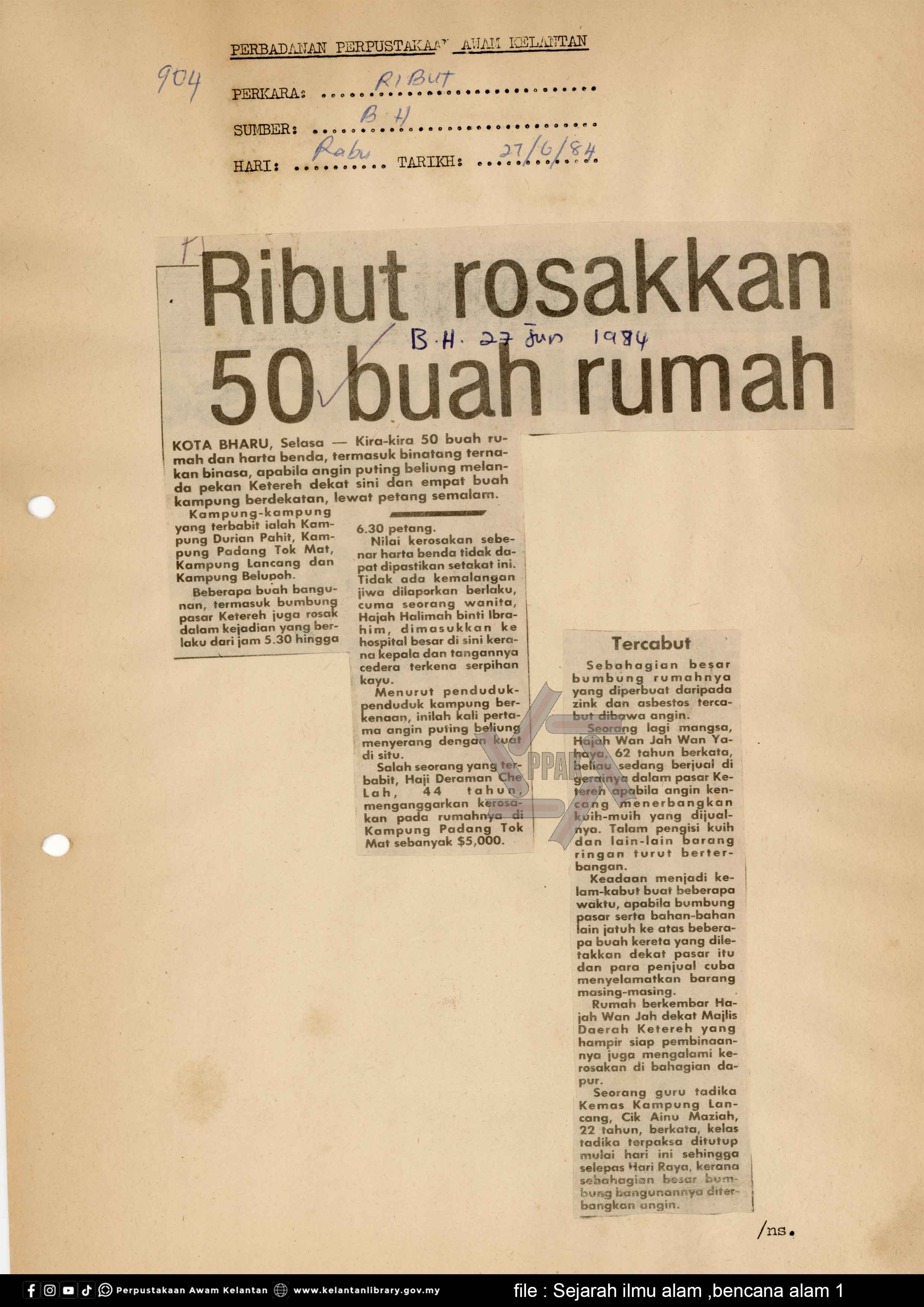 | BENCANA ALAM : Ribut rosakkan 50 buah rumah |